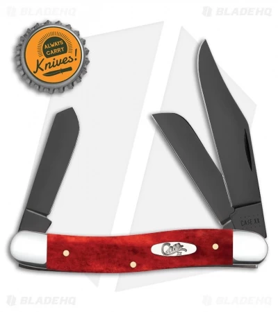 This Stockman has a smooth dark red bone handle and black PVD coated blades.