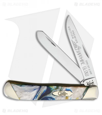 The Premier Edition Case Slanted Bolster Trapper knife with Sapphire Glow Corelon scales is a fantastic addition to any collection. Tru-Sharp surgical stainless steel blades are etched with “Premier Edition, One of 2,500, Sapphire Glow.” Sapphire Glow Corelon scales are a vivid swirl of blue, white and yellow, making each knife unique. Polished nickel silver bolsters with brass liners complete this beautiful and unique knife.
