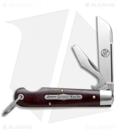 This Tidioute Cutlery Beer Scout Knife features a sheepsfoot blade and a bottle opener that doubles as a flat head screwdriver. The handle is fitted with dark maroon linen micarta scales and a nickel silver bolster.