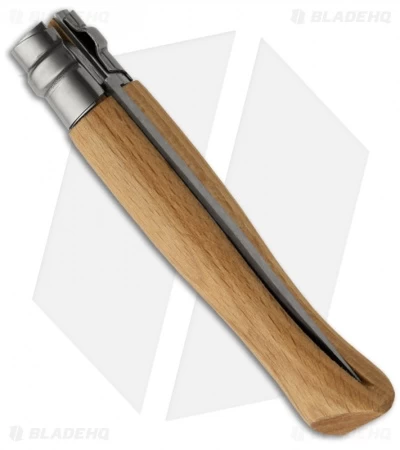 This Opinel #8 folder has a stainless steel blade and Beech wood handle. Includes the Virobloc safety ring that locks the blade in the open and closed positions. This traditional Opinel pocket knife is lightweight and inexpensive while displaying simple sophistication. Includes leather snap buckle sheath.