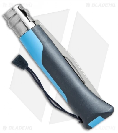The Opinel #8 Outdoor Blue folder is an ideal knife for adventurers. It has a Sandvik 12C27 stainless steel blade with a partially serrated ege. 4 mm-10 mm shackle key cut in blade. The polymer handle features a lanyard and integrated whistle rated for 110 dB. Includes the Virobloc safety ring that locks the blade in the open and closed positions.