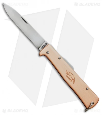 The Otter Mercator offers a minimalist design, built tough enough for everyday use and carry. It has a one-piece integral handle with a slim profile that rests comfortably in the pocket or hand. The sturdy lockback mechanism provides rock solid lock up and quick blade release. A bail loop and a nail nick opener add a classic touch to the design. This Mercator model has a copper handle and a carbon steel blade with a satin finish.